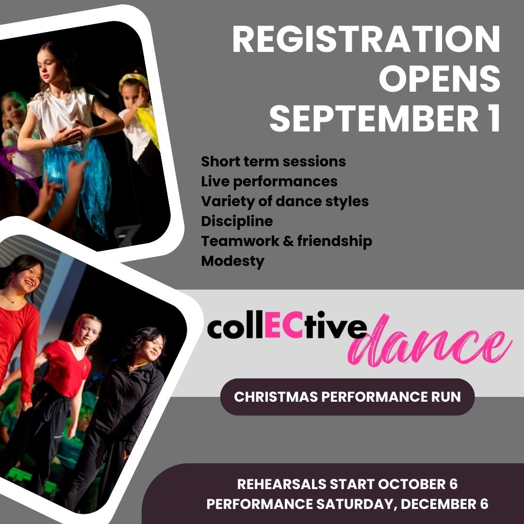 Youth dance rehearsals are once a week starting the week of October 6th and 7th, 2025 and will end with a performance during the CollECtive Arts Christmas event on Saturday December 6th, 2025 at Calvary Baptist Church. There will also be short dress rehearsals for each age group before the first performance that morning.